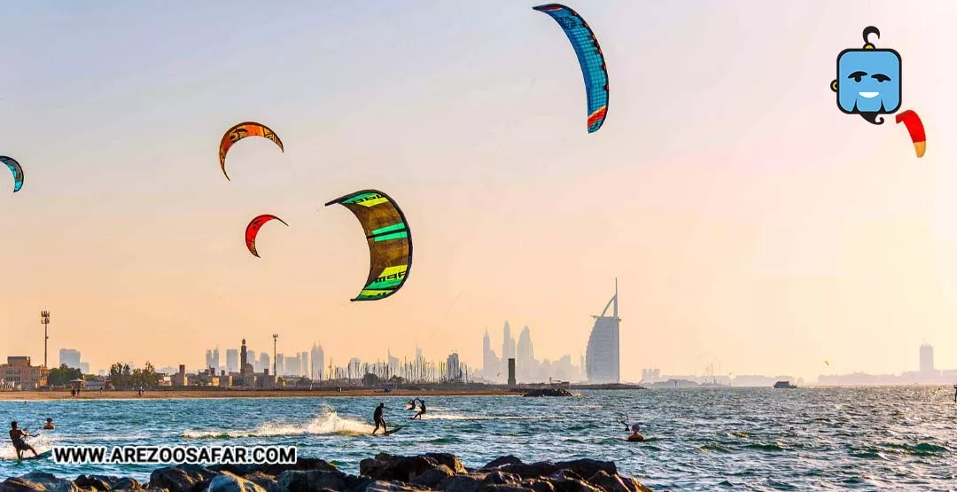 ساحل کایت جزء بهترین سواحل دبی است که شما میتوانید از تماشای خلیج فارس و آفتاب گرفتن در آن لذت ببرید. این ساحل یکی از بهترین جاهای دیدنی دبی برای تماشای پرواز بادبادکهاست. وجود بادبادکها، دریای خلیج فارس و برج العرب که در مقابل این ساحل قرار دارد میتوانند پس زمینه بسیار زیبایی برای گرفتن عکسهای یادگاری باشد. گردشگران در این ساحل معمولاً به بازیهایی مثل والیبال ساحلی مشغولاند و در کنار آن، امکانات رفاهی خوبی مثل فروشگاههای نوشیدنی و غذا وجود دارد. همچنین در کایت بیچ میتوانید به اینترنت وایفای رایگان هم دسترسی داشته باشید.